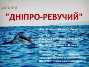 У суботу, 30 липня, за підтримки Переяслав-Хмельницької районної і міської ради на березі Дніпра проходитиме спортивно-просвітницький захід «Дніпро ревучий», у рамках якого відбудеться заплив через Дніпро на дистанції 3 кілометри; фотовиставка, присвячена селам, затопленим водами Канівського водосховища; розповіді про ті мальовничі місця, які сьогодні опинилися під водою.