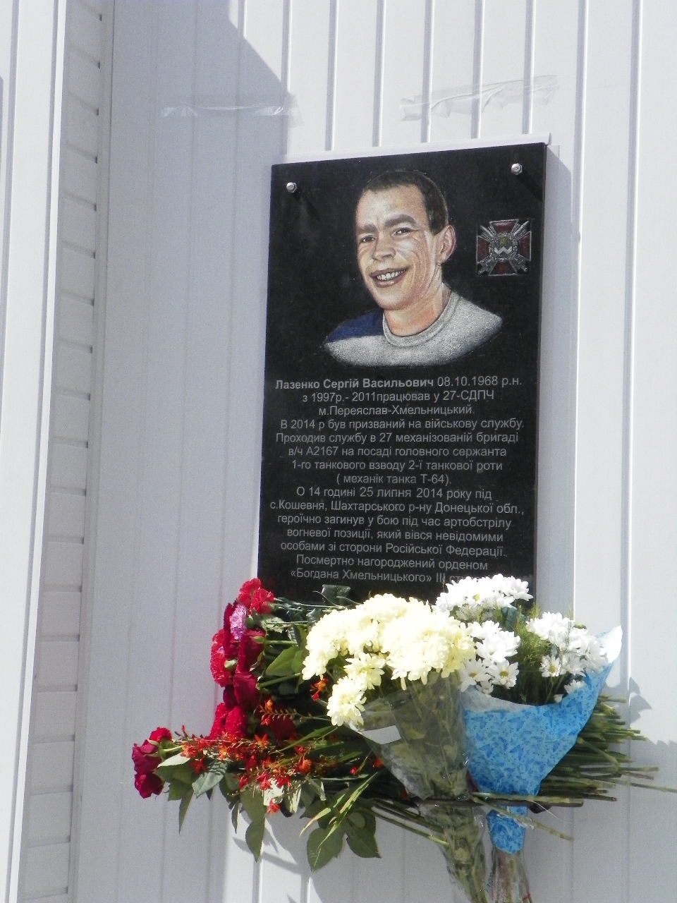 21 серпня на приміщенні пожежної частини у місті Переяславі-Хмельницькому було відкрито меморіальну дошку Сергію Лазенку, який 25 липня минулого року загинув на кордоні з РФ, захищаючи Україну від зовнішнього агресора. Його танк було підбито з території Росії. На відкритті пам’ятної дошки були присутні мама Сергія Васильовича – Любов Павлівна, дружина – Наталія, 6-річна донечка Неля. На церемонії відкриття були присутні міський голова Тарас Костін, демобілізовані воїни із зони АТО, волонтери, рятувальники місцевої пожежної частини з якими Сергій Лазенко служив в пожежних розрахунках та жителі Переяслава.