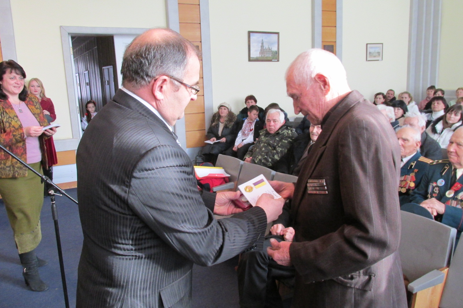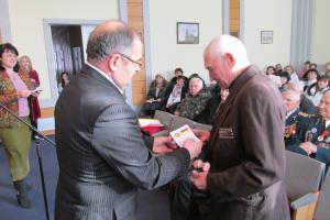 , які живуть в Переяславі-Хмельницькому від Київської обласної організації ветеранів України. Зі словами глибокої вдячності та поваги до ветеранів звернулися секретар міської ради Петро Бочарін, заступник міського голови Валентина Губенко, голова міської ради ветеранів Єлизавета Миздренко. 50 медалей з відповідними іменними посвідченнями за підписом голови обласної ради ветеранів Миколи Томашова отримали тільки безпосередні учасники бойових дій. Ветеранам, які за станом здоров’я не змогли взяти участь у заході, медалі будуть вручені за місцем їх проживання. Церемонію нагородження медалями провели Валентина Губенко та Єлизавета Миздренко. У концертній програмі урочистого заходу, підготовленій відділом культури і туризму міської ради, звучали пісні у виконанні самодіяльних артистів міста Миколи Гриценка, Наталії Александрової, молодих виконавців Лізи Маслюкової, Даши Середи. Присутні вшанували пам’ять полеглих хвилиною мовчання, а також сфотографувалися на пам’ять про цю подію.